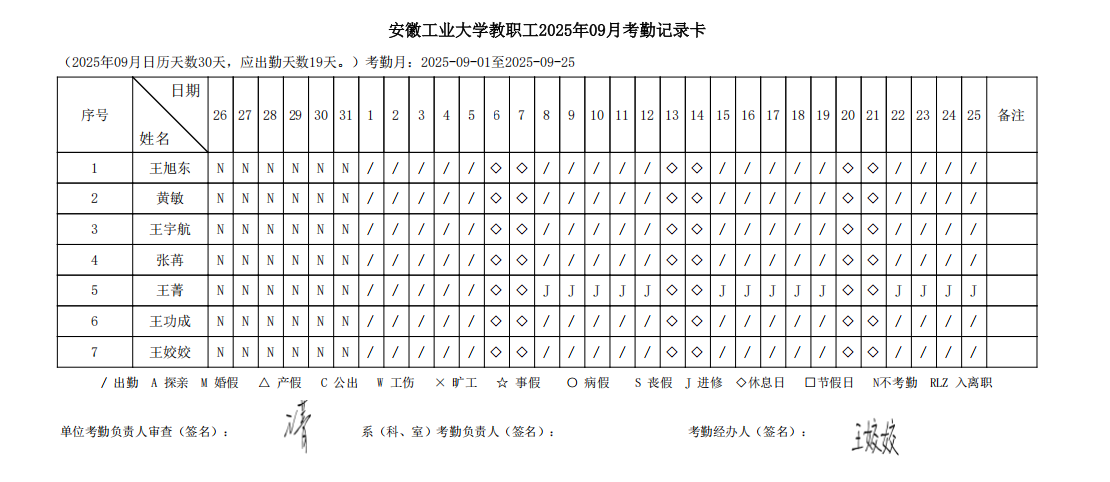 根据《安徽工业大学教职工考勤及请销假规定》的要求,现将2025年9月教职工考勤情况进行公示。公示期为9月26日-9月29日,如有异议,请在公示期内以电话或书面形式反映,联系人:王姣姣 ,联系电话:2311372。