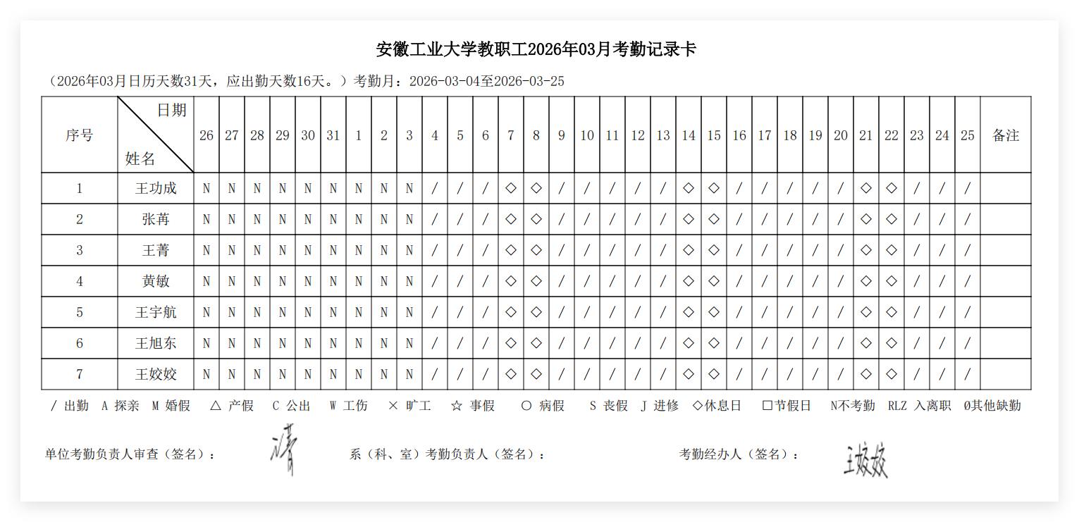 根据《安徽工业大学教职工考勤及请销假规定》的要求,现将2026年3月教职工考勤情况进行公示。公示期为3月26日-3月30日,如有异议,请在公示期内以电话或书面形式反映,联系人:王姣姣 ,联系电话:2311372。