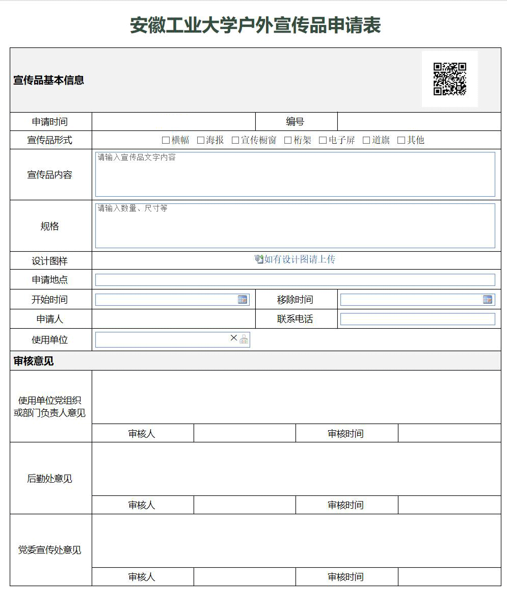 第八条 审批内容主要包括:各类户外宣传品的内容、地点和期限等。户外宣传品具体负责人应在户外宣传品设置前登录校园网智慧校园系统,填写《安徽工业大学户外宣传品申请表》,提交审批单位主要负责人审批,审批通过后方可进行设置。党委宣传部、安全保卫部、后勤处对审批情况进行查阅备案。