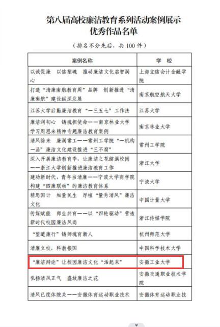 近日,教育部公布第八届高校廉洁教育系列活动评选结果,我校廉洁文化工作案例《“廉洁辩论”让校园廉洁文化“活起来”》入选优秀作品,为安徽省属本科院校唯一入选作品。
