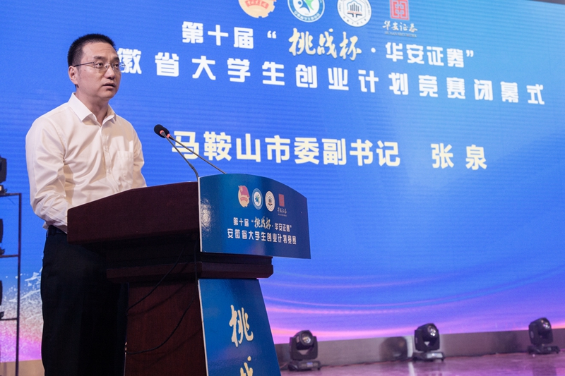 张泉代表马鞍山市委市政府致辞,简要介绍了马鞍山的区域位置和产业经济发展概况,重点介绍了马鞍山的创新创业发展情况,希望同学们把大赛中收获的创业灵感、热情和经验,化为继续前行的不懈动力,努力成为实现中华民族伟大复兴的先锋力量。