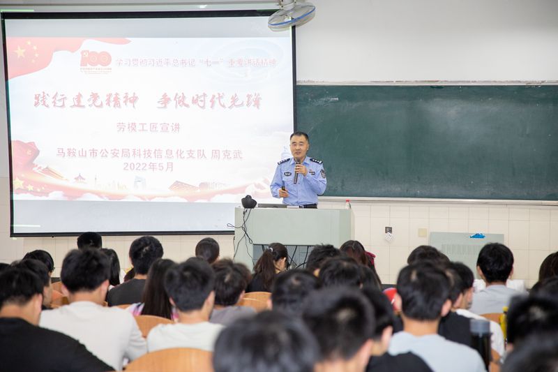为深入贯彻落实《中共安徽省委教育工委在全省高校组织开展新时代先进人物进校园推进“英模•大师进思政课堂”的通知》要求,结合我校“7+X”协同立德树人关键课程建设攻坚项目实施,5月24日下午,由马克思主义学院和安徽省大学生思想政治教育与管理研究中心举办的“英模•大师进思政课堂”主题报告会在秀山校区举行。“全国先进工作者”、“全国公安系统二级英雄模范”、“中国好人”、“全国优秀人民警察”、“全国公安科技工作先进个人”、“全国公安机关金盾工程一期建设先进个人”、“安徽省道德模范”、“安徽省人民满意的公务员”、“安徽省岗位学雷锋标兵”、“安徽省优秀共产党员”,马鞍山市公安局科技信息化支队支队长、我校兼职思政课教师周克武走进思政课堂,为师生们带来《践行建党精神争做时代先锋》的主题报告。报告会采取线上线下相结合的方式进行,马克思主义学院全体师生和各学院师生代表聆听了报告会。