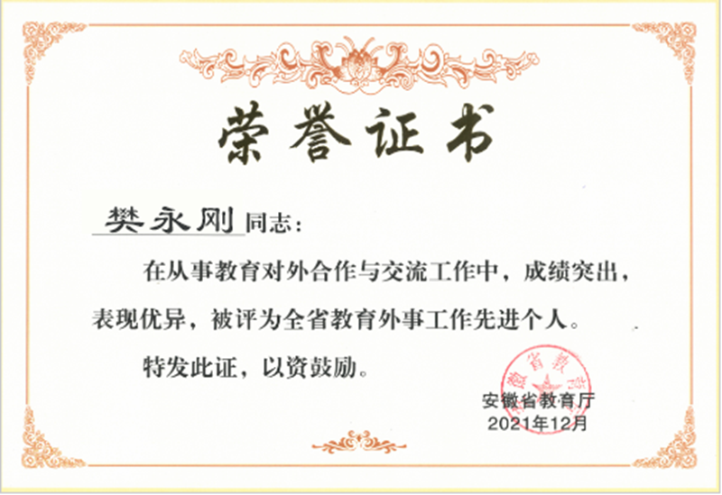 12月29日,省委教育工委、省教育厅以视频会议方式召开全省教育外事工作会议,并对全省教育外事工作先进单位和先进个人进行表彰。我校荣获“全省教育外事工作先进单位”荣誉称号,国际合作与交流处樊永刚荣获“全省教育外事工作先进个人”。