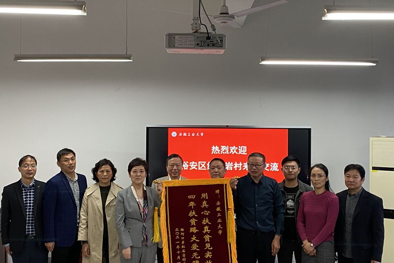 10月29日下午,我校原帮扶村六安市裕安区西河口乡红石岩村村委会主任金宗岗一行专程来校,向学校赠送“用真心扶真贫见实效、四年扶贫路大爱无疆”锦旗,表达对我校四年来扶贫工作的感谢。校党委副书记祖明与红石岩村两委成员亲切座谈,校工会负责人、原红石岩村驻村干部、红石岩村两委委员参加座谈会。