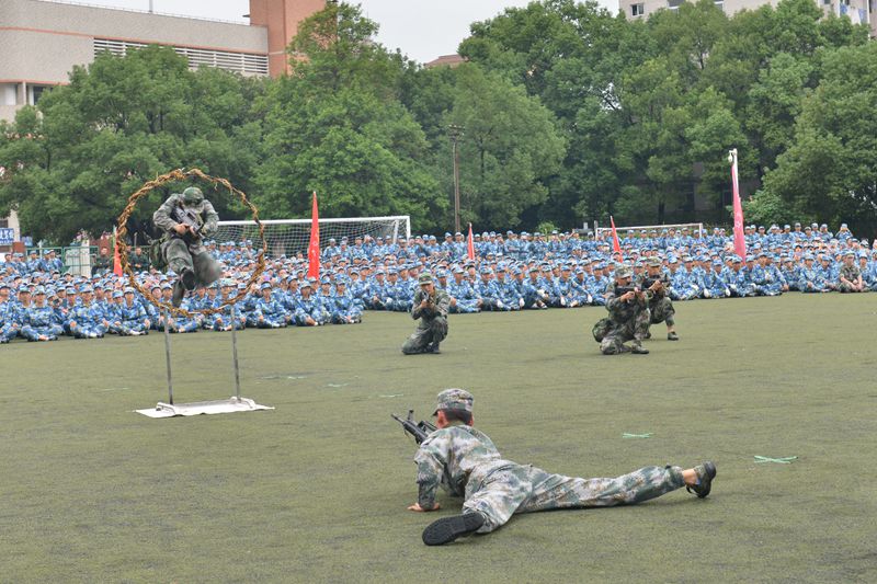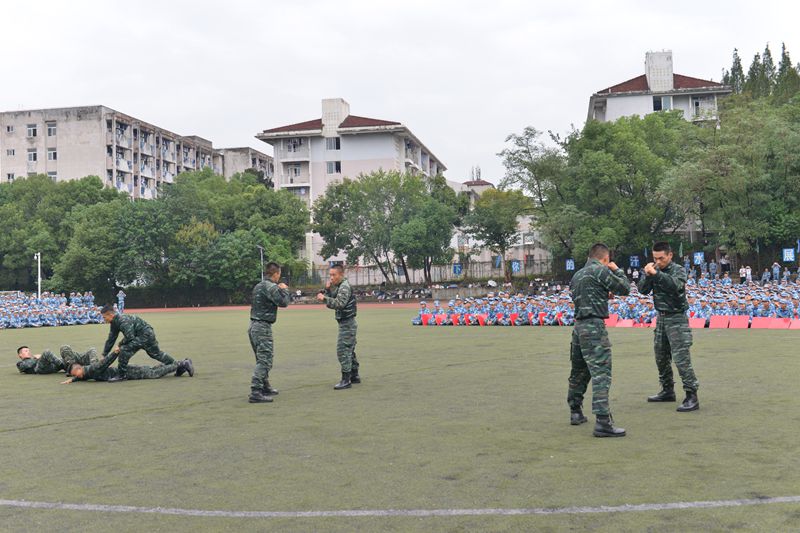 在军训成果汇报环节,参训新生分别进行了行进间队列和特色方队展示。来自14个学院的18个队列展示方队迈着正步依次经过主席台,他们步伐整齐划一,口号铿锵有力,充分彰显了坚韧不拔、昂扬向上的精神风貌和优秀的训练成果,赢得了在场师生的阵阵掌声。之后,参训新生分别展示了擒敌拳、匕首操、战术和战场救护等特色训练课目,武警教官带来了精彩的格斗基本功。