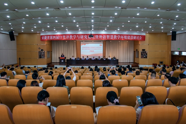 7月10日上午,安徽省第四届口笔译教学与研究论坛暨外语智慧教学环境建设研讨会在我校举行。副校长王先柱、全国翻译专业学位研究生教育指导委员会主任委员黄友义、安徽省外国语言文学类专业合作委员会主任朱跃出席开幕式,我校外国语学院负责人以及省内外专家、学者和学生共150余人参加开幕式。开幕式由外国语学院院长曹瑞斓主持。