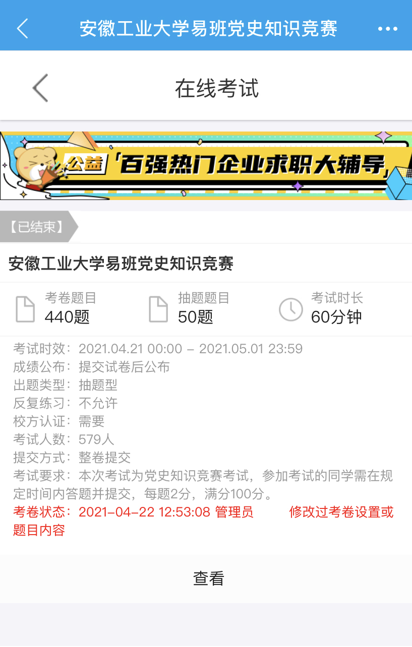 学校利用易班优课平台开展党史知识竞赛活动,“毛泽东发表《论持久战》其主要内容包括”、“中国共产党在全民族抗战中发挥的中流砥柱作用主要体现在”、“社会主义市场经济条件下公有制经济与非公有制经济的关系是”,题目涵盖政治、经济、文化、军事、生活等各个领域,时间跨度从中国共产党的创立到成为抗日战争的中流砥柱,从夺取新民主主义革命的胜利到社会主义建设的曲折发展,到中国特色社会主义进入新时代。党史知识竞赛在学生群体中掀起浓厚的党史学习氛围,579名同学在规定时间内完成50道从题库中随机抽取形成的线上试卷进行作答,同学们在答题过程中梳理了党史的脉络,提升了理论知识素养。