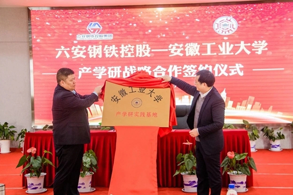 魏先文和王建兵共同为“安徽工业大学产学研实践基地”揭牌,水恒福和六钢集团副总裁李伟分别代表校企双方签订产学研战略合作协议。
