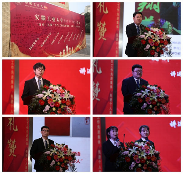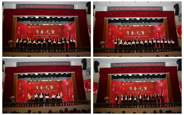 会上,祖明宣读了学校2019-2020学年学生工作表彰决定。校领导为获得校暑期社会实践优秀团队、校“十佳班级”、校“三好学生标兵”、校第九届自强之星和2019年度“中国大学生自强之星”、校“青年五四奖章”(学生)、宝钢优秀学生奖学金、国家励志奖学金、国家奖学金、第九届“挑战杯”安徽省大学生创业计划竞赛金奖、2020年大学生学科和技能竞赛A类赛事国家一等奖等十大类奖项的先进集体、先进个人代表颁发奖牌、证书。