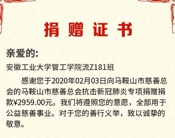 “亲爱的安徽工业大学管工学院流z181班,感谢您于2020年2月3日向马鞍山市慈善总会抗击新冠肺炎专项捐款……”前日,管工学院流Z181班的同学们收到了马鞍山市慈善总会发来的捐赠证书,而这还得从管工学院近期开展的一系列公益募捐活动说起。