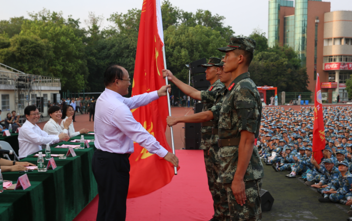 军训号角吹响,梦想迎帆起航。2019级新生军训成立了2019级新生军训师,下辖3个团,14个营,63个连。在雄壮的进行曲中,刘新跃向军训师授旗,军训师师长上台接旗,为期两周的军训正式拉开序幕。