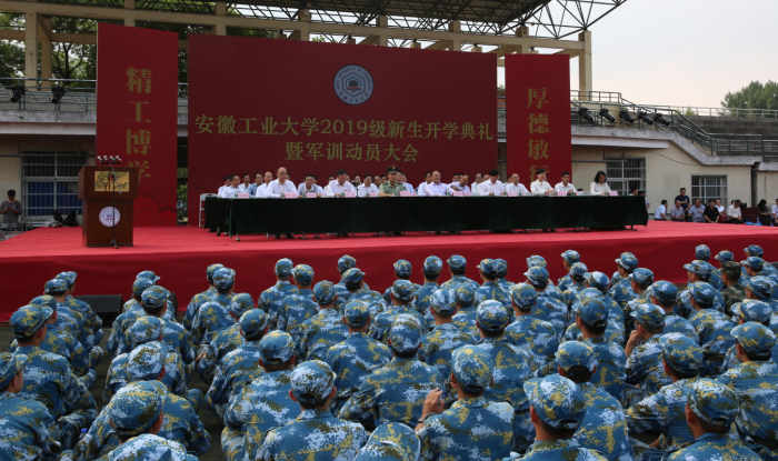 9月11日下午,佳山校区田径场军歌嘹亮,队旗飘扬,我校2019级新生开学典礼暨军训动员大会隆重举行。在校校领导刘新跃、魏先文、祖明、顾明言、刘明,武警马鞍山市支队副支队长张克才,校友代表、中冶华天工程技术有限公司党委副书记、总经理李惠莹,校党委常委,各学院(部)党委(党总支、直属党支部)书记、院长(主任)出席大会。校党委书记刘新跃向学生军训师授旗,校长魏先文致辞。大会由校党委副书记祖明主持。