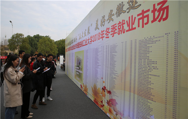 11月10日,安徽省工科类高校毕业生就业市场暨我校2018年冬季就业市场在秀山校区4个场馆举办,来自全国17个省市的475家用人单位,提供了1.3万个就业岗位。会前,校党委书记刘新跃多次听取工作汇报,要求精心组织好就业市场,促进毕业生充分和高质量就业。校长魏先文,副校长祖明、林钟高、顾明言和安徽省大中专毕业生就业指导中心副主任袁江林一同到就业市场检查指导工作,与参会单位代表和毕业生进行交流,了解社会和行业的岗位需求以及毕业生求职情况。各院领导班子、专业教师和毕业班辅导员在各招聘会场中,对接用人单位,收集企业需求,指导毕业生就业。